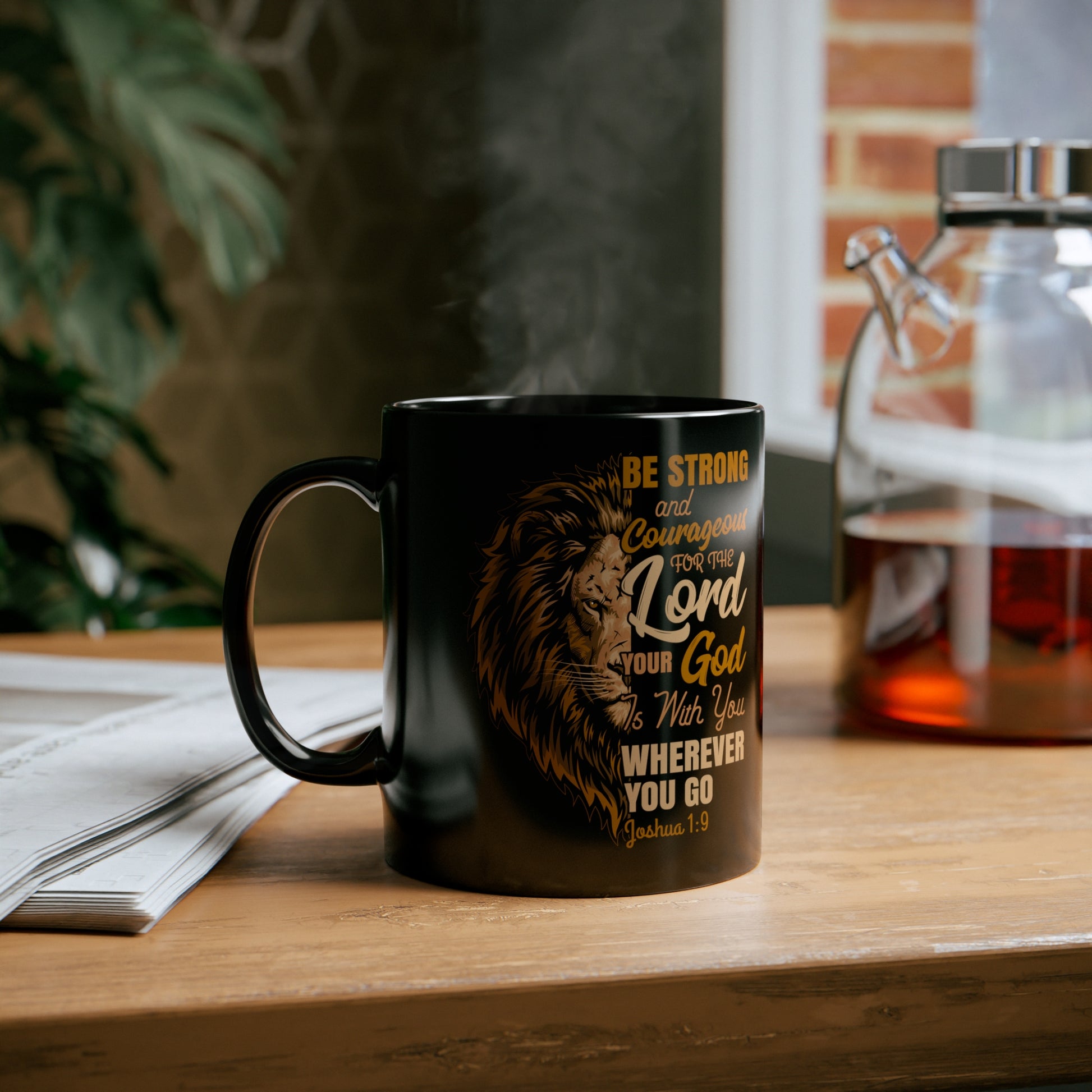 Be Strong and Courageous Coffee Mug, adorned with Bible Verse Joshua 1:9 | Black Ceramic Coffee Mug