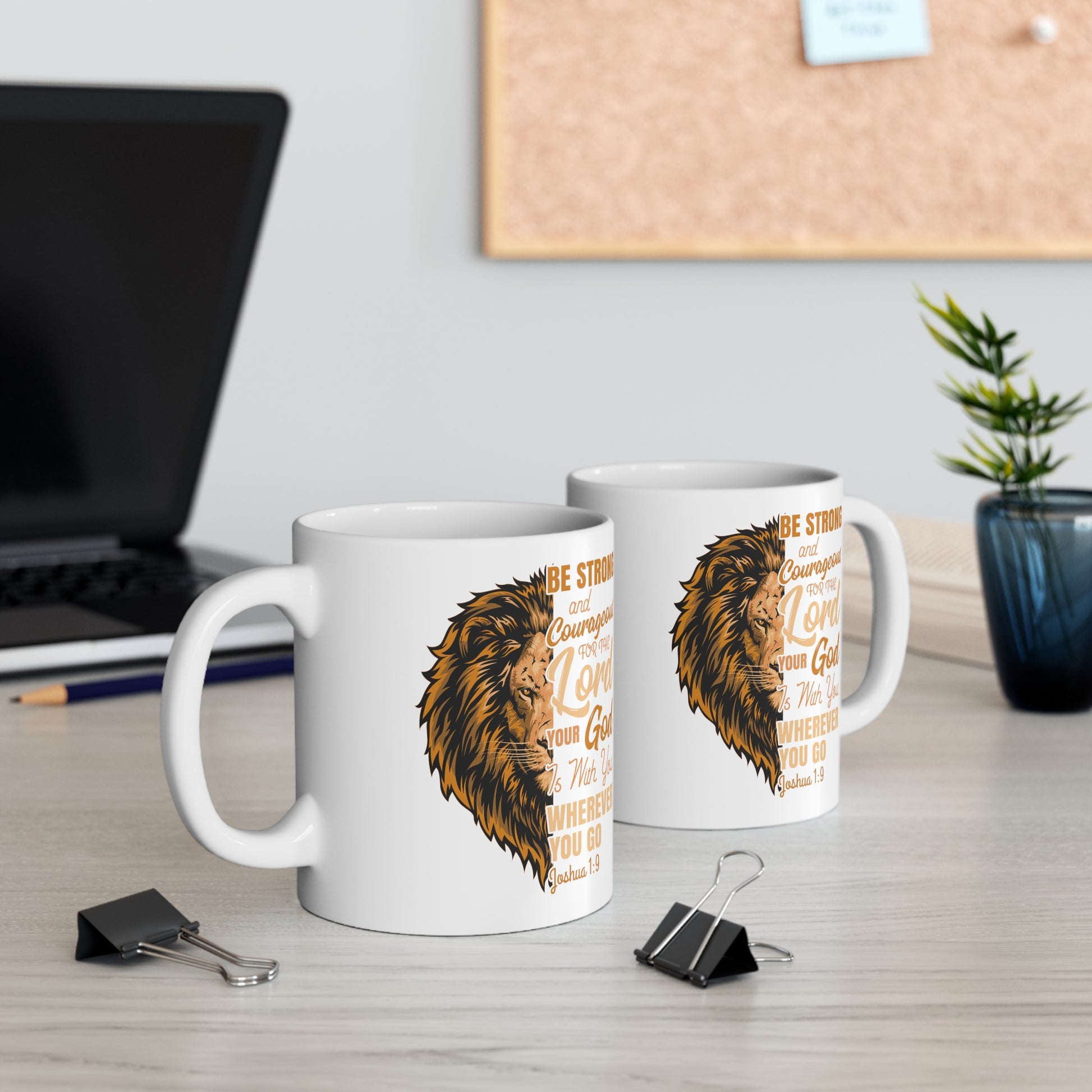 The verse "Be strong and courageous. Do not be afraid; do not be discouraged, for the Lord your God will be with you wherever you go" serves as a daily reminder of God's unwavering presence and support. Crafted with premium ceramic, this mug is designed to accompany you through every moment, infusing your day with courage and hope.
