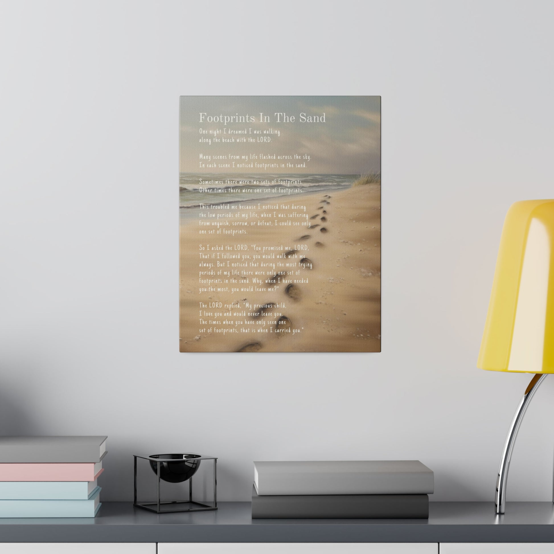 Footprints In The Sand is a classic faith-based poem. This artwork features this classic Christian Footprints poem with an oil painting of a beach scene with footprints in the sand.