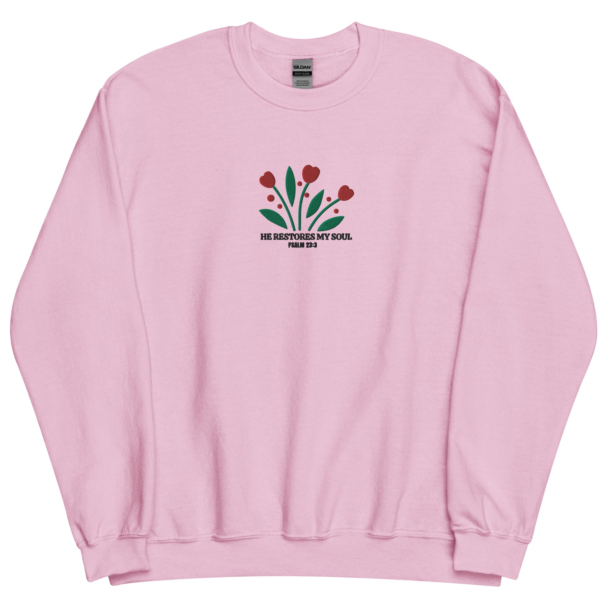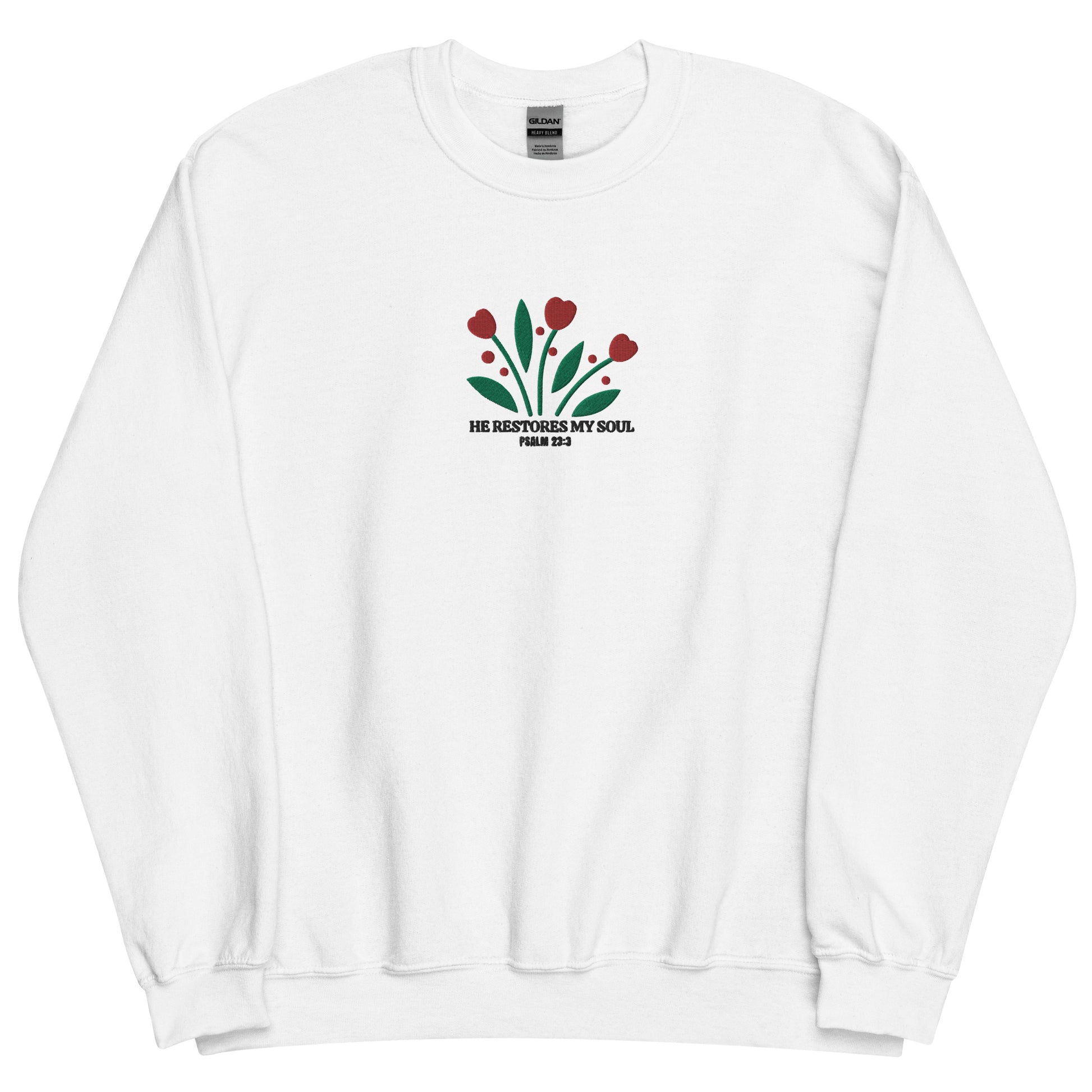 This Christian Sweatshirt features Embroidered flowers and Scripture from Psalm 23:3. This Crewneck Sweatshirt combines faith, comfort, and fashion in one elegant design.