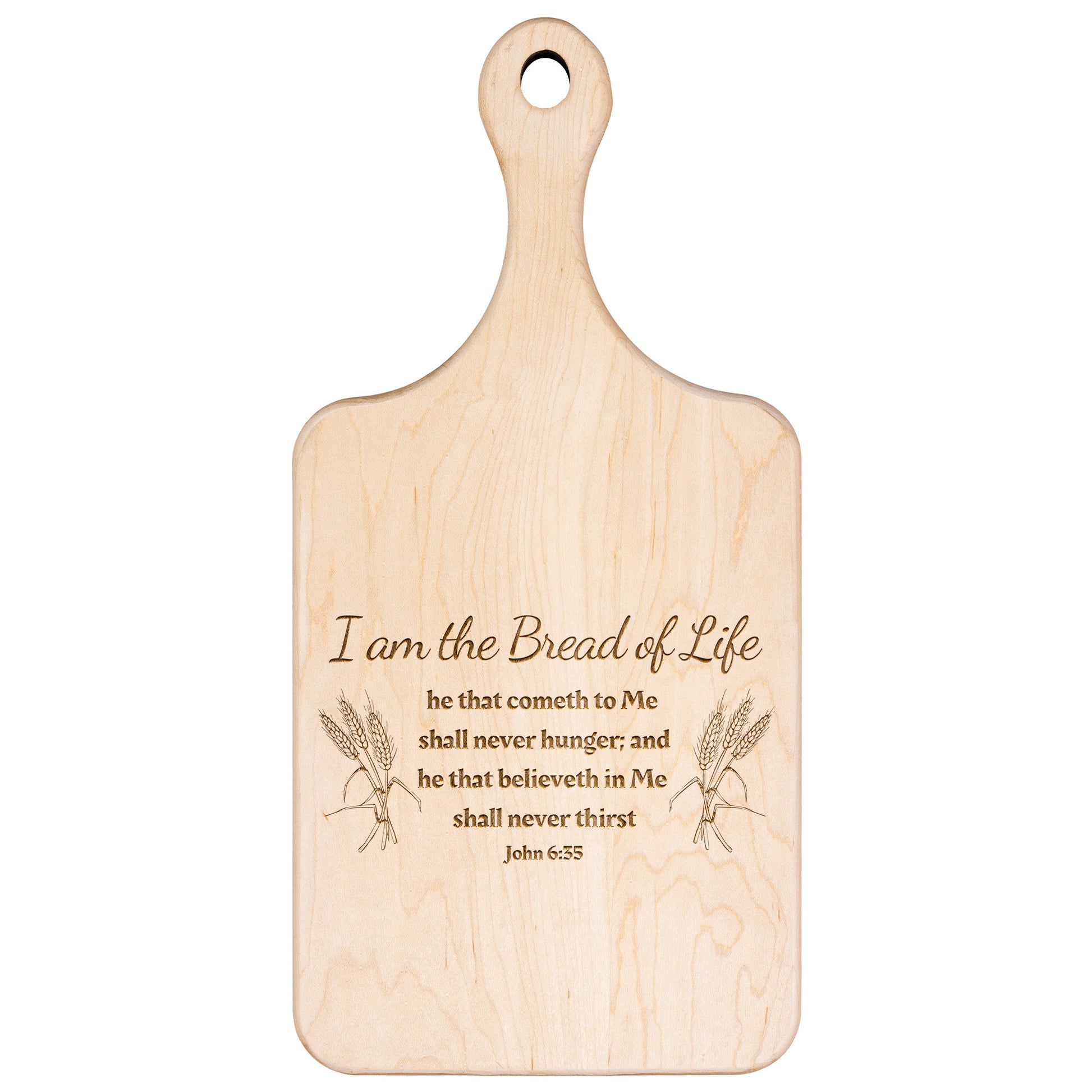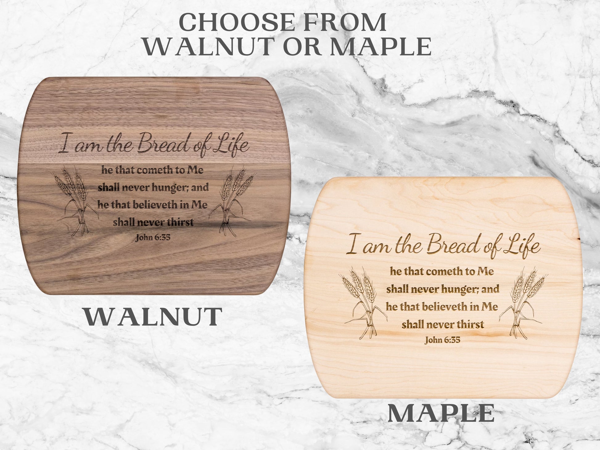 This wood cutting board is engraved with the Bible verse from John 6:35, where Jesus said, 'I am the bread of life. Whoever comes to me will never go hungry, and whoever believes in me will never be thirsty.'