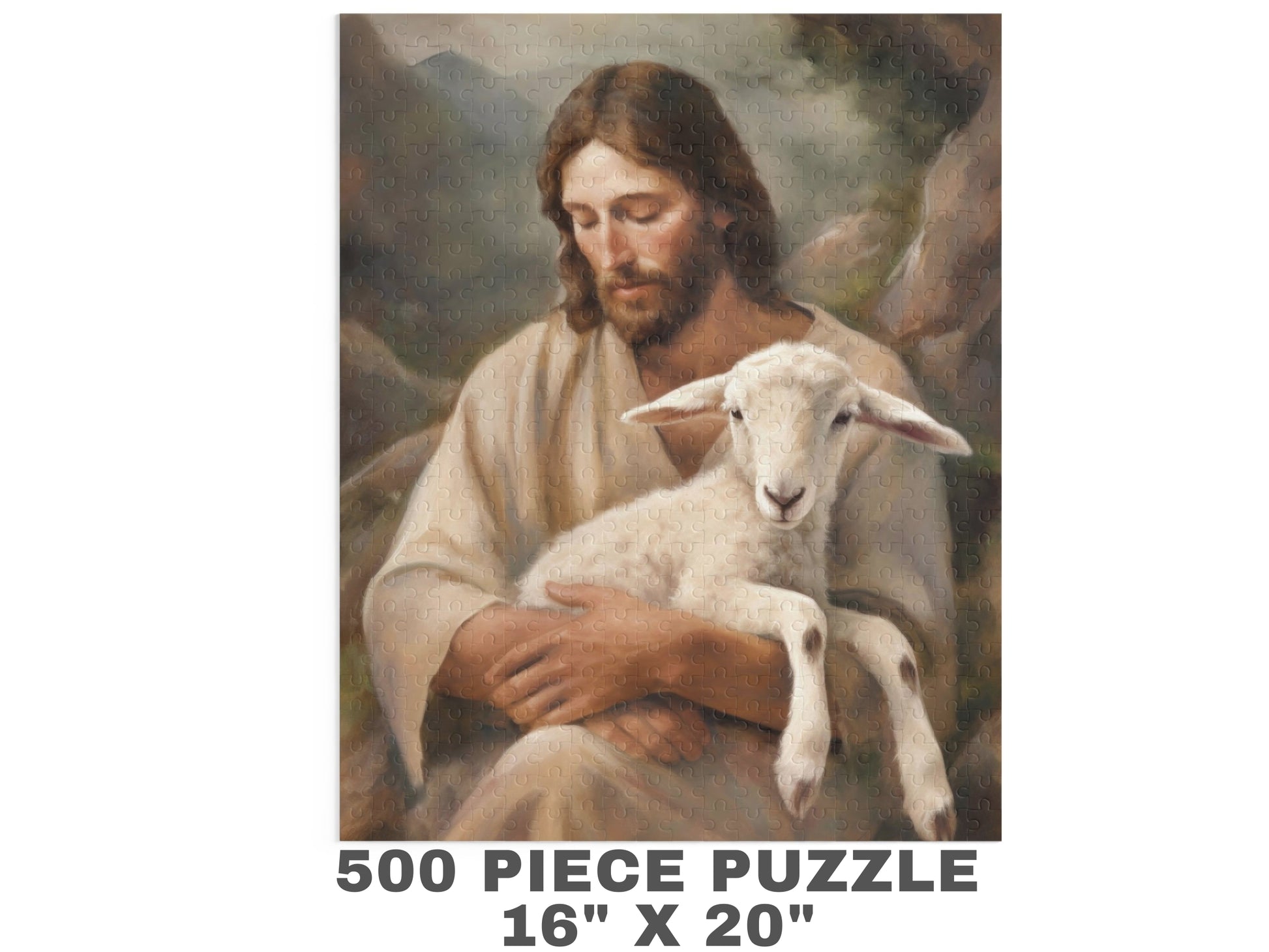 The puzzle features a painting of Jesus holding a lamb, it depicts the love and compassion of Jesus Christ as the Good Shepherd.