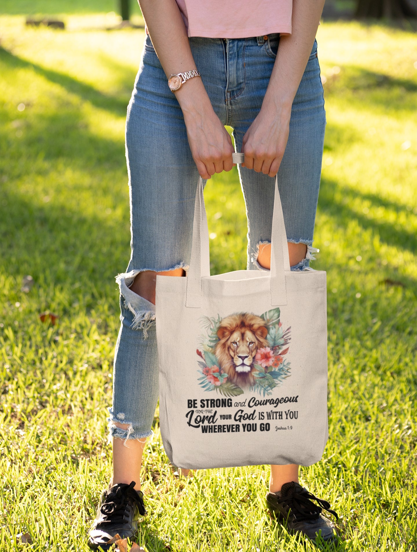 Scripture Tote Bag - Be Strong and Courageous Joshua 1:9 | Floral Lion Christian Tote