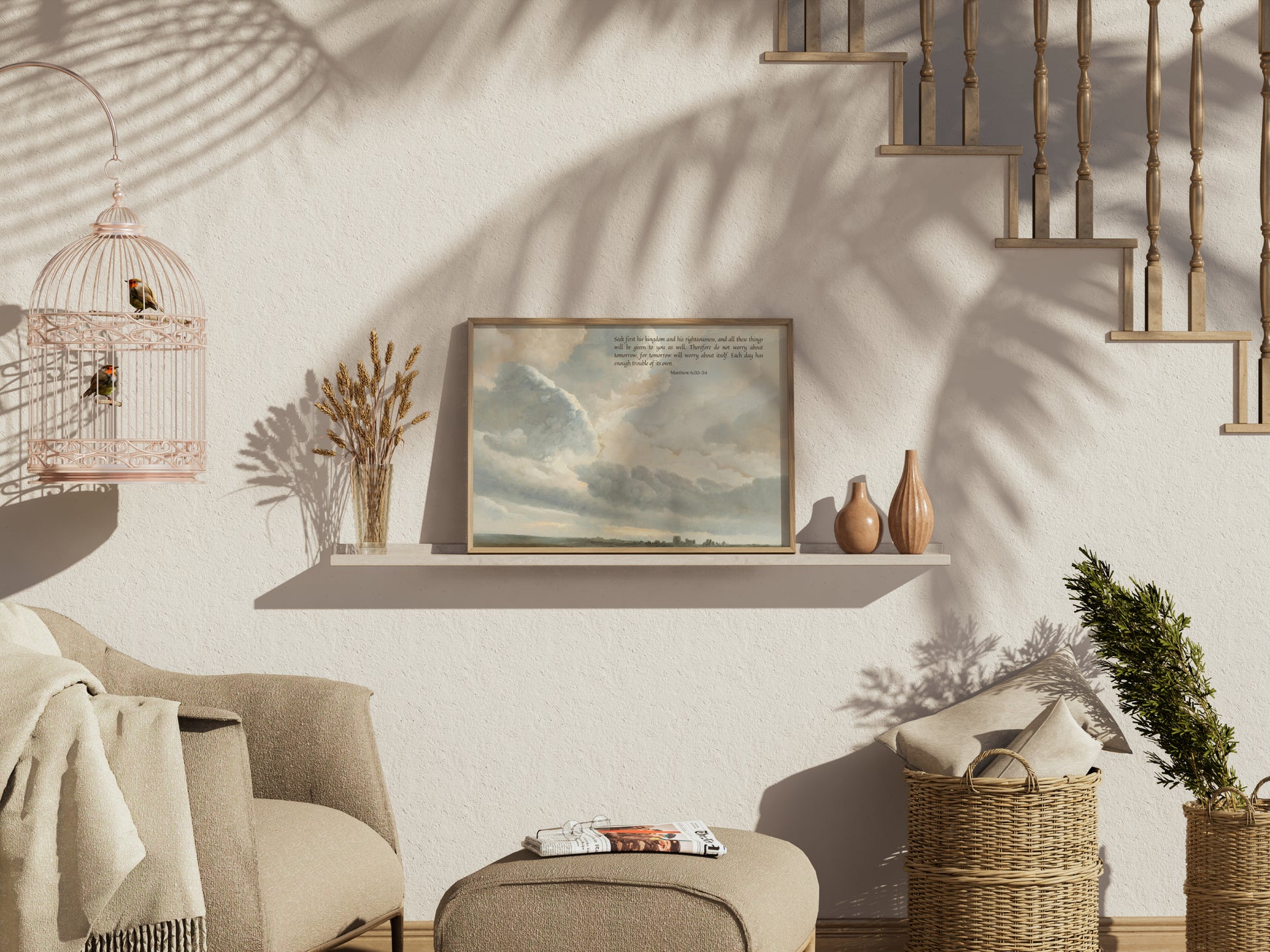 This piece of Christian home décor seamlessly combines the timeless wisdom of Matthew 6:33 with the beauty of a vintage cloud painting, creating a harmonious blend of faith and artistry.